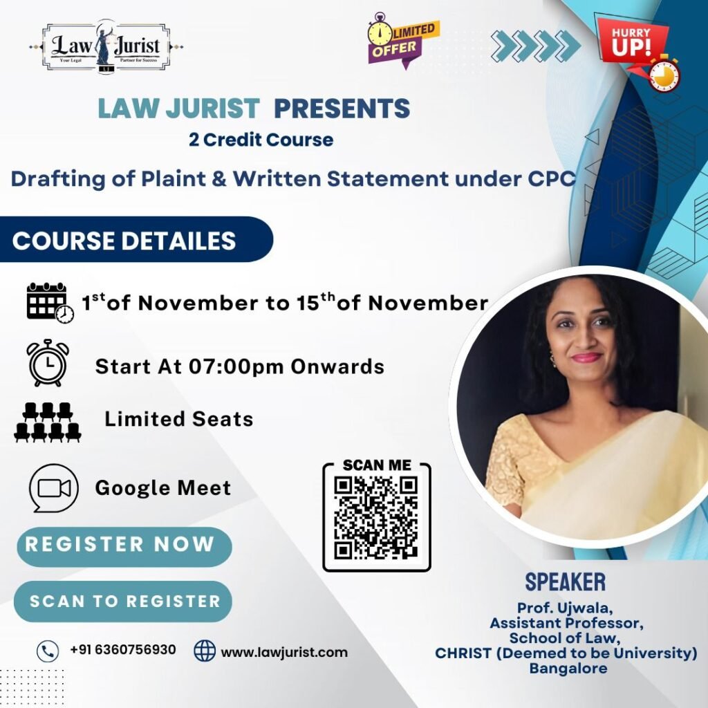 Take your legal drafting skills to the next level with our 2 Credit Course on Drafting of Plaint & Written Statement under CPC, designed for law students, judicial aspirants, and young professionals.