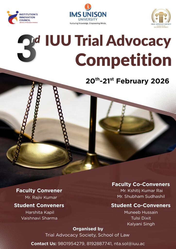 The School of Law, IMS Unison University, Dehradun, is set to host the 3rd IUU Trial Advocacy Competition, scheduled for 20th–21st February 2026. This national level criminal trial advocacy competition invites law students across the country to step into the shoes of trial lawyers and test their advocacy where it truly matters inside the courtroom.